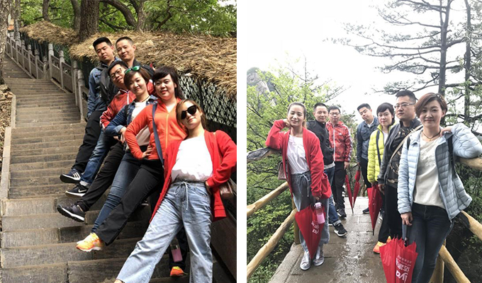 次日,一早就飘起绵绵细雨,但小伙伴们无畏风雨攀登白云山。满山苍翠中,完美体育官方网址的红雨伞显得格外亮眼,成为山谷中的一道风景线。