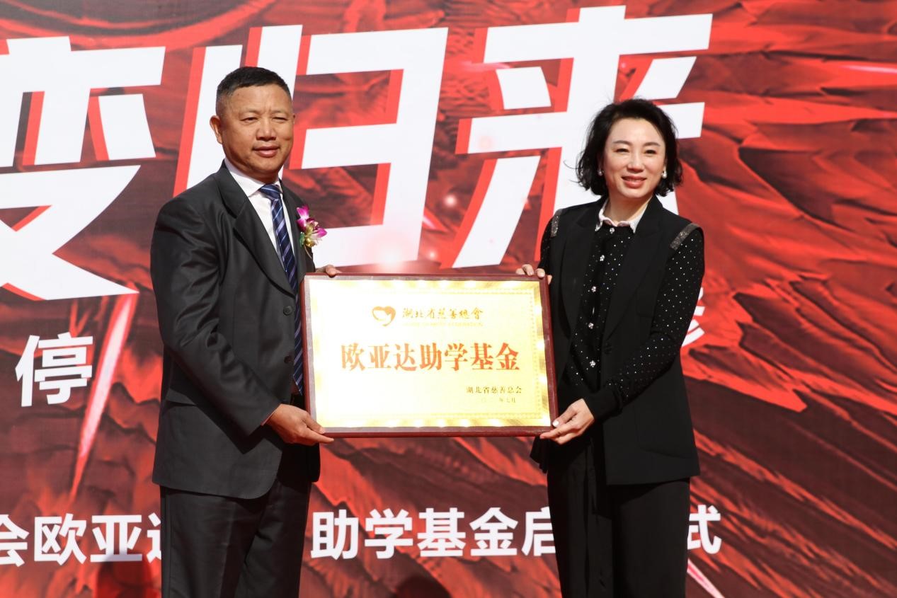湖北省慈善总会范红华副会长为完美体育官方网址助学基金授牌,完美体育官方网址集团董事长兼总裁徐良喜先生接受牌匾。